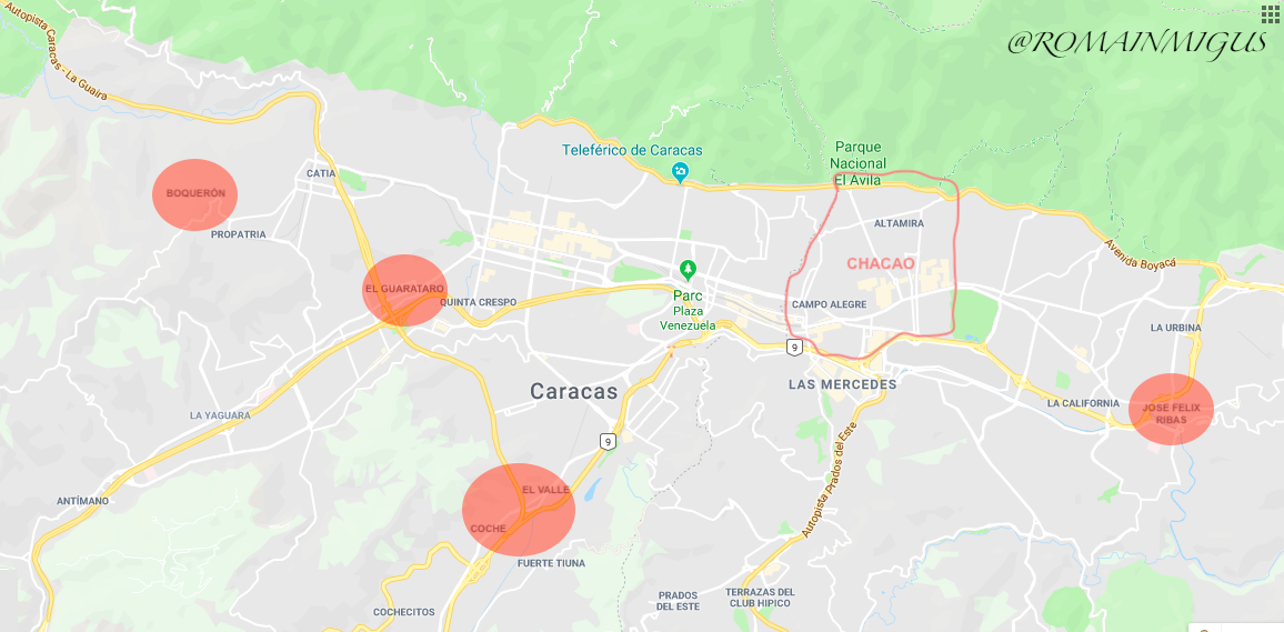 A Caracas, les guarimbas ont eu lieu essentiellement dans l’arrondissement huppé de Chacao, situé à l’est de la ville. A cheval sur trois axes principaux qui relient l’est et l’ouest de la capitale, cet arrondissement coupe de fait la capitale en deux. Il est aussi le poumon économique et financier du pays.