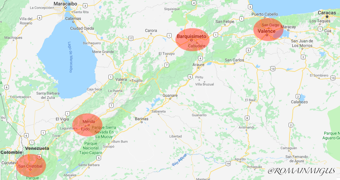 Les territoires mentionnés permettent de bloquer l’approvisionnement des grandes villes en contrôlant les voies de communications. Cabudare est l’entrée de Barquisimeto depuis les Etats agricoles situés au sud. De nombreux produits destinés aux métropoles de la côte transitent par cette importante ville vénézuélienne. San Diego est situé à la périphérie de Valencia, capitale industrielle du pays, sur la route qui mène à Caracas. Cette ville est aussi établie sur la route qui conduit à Puerto Cabello, le principal port du Venezuela. Ajoutons que Barquisimeto et Valencia sont des points de passage obligés sur les axes routiers qui relient Maracaibo, et la région pétrolière du Zulia, à Caracas et au reste du pays.